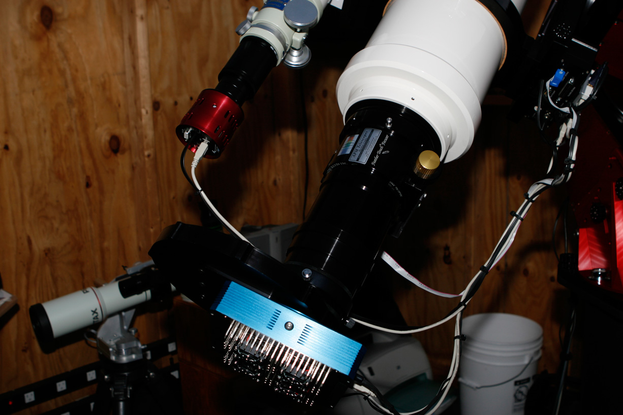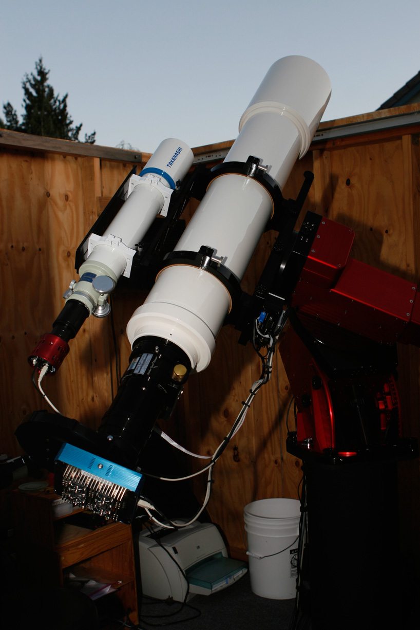 This is my imaging set-up, a TMB 175mm f8 APO refractor, with an Apogee U16M camera using the AI-FW50-7S filter wheel. I bought this fine refractor off Astromart in February 2009, and I am the third owner. This TMB scope has seen very little use looks to be brand new. The tube for this scope is not the standard TMB/APM model. Markus Ludas had the tube built for an Aries Fluorite Lens that was never finished, so in September 2004 he installed a very nice 97.4 Strehl TMB lens, and this scope was born. I like the creme color and the look of this tube better the either the CNC of LW tube of the current APM 175 f8 models. The image train includes a APM Field Flattener that seems to do an effective job of producing pinpoint stars all the way to the corners of that big Kodak 16803 chip. The FRC-300 that I had been using was an excellent scope, but I came to realize that I really was a "refractor guy" at heart. At 1400 mm focal length and the large chip of the U16M, this set-up provides a wonderful field of view. The guide scope sitting on top of the "Big Gun" is a Takahashi FS-78, yet another wonderful Takahashi scope, and a great guidescope. I've used a Borg Mini45ED and a Takahashi FS-60 as guidescopes in previous configurations, but I like the additional focal length offered by the FS-78. The guiding camera duties are handled by a Starfish guider from Fishcamp Engineering. The Starfish was a new product that began shipping in January of 2007, and I think mine was one of the first production units sold. It seems to be very sensitive and with a 1.3 megapixel CMOS chip and 5.2 micron pixels, it provide a large 33 x 42 arcminute field of view and an image scale of 1.96 arcseconds per pixel with the FS-78. The Starfish is very well made (excellent fit and finish) has done everything I've asked of it so far, even helping to touch up the collimation of the FRC. It is just a bit of icing on the cake that the beautiful red finish matches the Paramount so well - this little camera is a keeper. The imaging camera will be focused by an excellent Starlight Feathertouch 3.5" focuser using a Robofocus. All the custom adapters needed to attach the The camera to the focuser/corrector, while maintaining the proper backspacing distance, were made by Ashley Stevens at PreciseParts. Other pieces of hardware in the observatory include the nicest equipment I have found in the war against dew - the DewBuster controller coupled with Dew-Not heater strips. I highly recommend the DewBuster! It is simply the most controllable, most effective dew controller system I've used to date, and the Dew-Not strips are without a doubt the best available. Software: Software is an ever changing suite of applications, as I look for the right mix of automation and control. This is what I'm currently using: