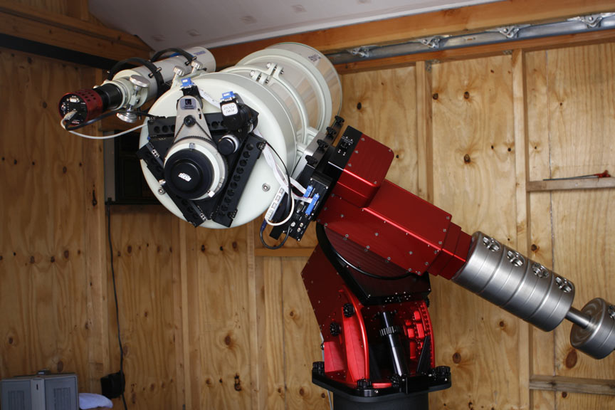 This was the imaging set-up I used until 1st Qtr 2009, a Takahashi FRC-300 Ritchey-Chretien. I picked up the FRC in a trade about 18 months ago, and have been very happy with it. It is built like a tank (so typical of Takahashi) and is capable of producing some excellent images - much better than my limited imaging abilities and the local seeing conditions will usually let me demonstrate. But on those rare occasions when everything works out just right, the scope shows what it is capable of. With a focal length of 2340 mm, it produces an nice flat image circle of 90 mm, and an image scale of 0.79 arcseconds per pixel using a camera with 9 mircon pixels. Speaking of cameras, you might notice that my set-up seems to be missing an imaging camera. I am waiting for a new Kodak 16803 chip camera, which should be available in May of 2007. The guide scope sitting on top of the FRC is a Takahashi FS-78, another wonderful Takahashi scope, and a great guidescope. I've used a Borg Mini45ED and a Takahashi FS-60 as guidescopes in previous configurations, but I like the addition focal length offered by the FS-78. The guiding camera duties are handled by a Starfish guider from Fishcamp Engineering. The Starfish was a new product that began shipping in January of 2007, and I think mine was one of the first production units sold. It seems to be very sensitive and with a 1.3 megapixel CMOS chip and 5.2 micron pixels, it provide a large 33 x 42 arcminute field of view and an image scale of 1.96 arcseconds per pixel with the FS-78. The Starfish is very well made (excellent fit and finish) has done everything I've asked of it so far, even helping to touch up the collimation of the FRC. It is just a bit of icing on the cake that the beautiful red finish matches the Paramount so well - this little camera is a keeper. The imaging camera will be focused by a Clements 4.25" Bellerophon focuser using a Robofocus. If this is your first time seeing a Clements focuser, you need to check the web site out. This focuser is simply amazing! It is smooth and accurate, seems unaffected by any reasonable load (a very important feature given the size and weight of the cameras being built these days). It produces the best v-curves in FocusMax that I've ever achieved with this scope. Adding the Clements focuser achieved two important objectives for me. First, it replaced the standard Takahashi helical focuser, which was a fine focuser, but not very CCD or remote operation friendly. Second, the large 4.25" aperture of the Bellerophon lets me move the corrector element to the camera side of the focusing device and "fix" the metal-back distance to the CCD chip. It is a very sweet set-up, and has a distinctive appearance that really grows on you the more you use it. Don Clement was a joy to work with, and made all the custom adapters needed make the focuser fit. Finally, I've adapted one of Don Goldman's TAKometers and a Takahashi 4" Camera Angel Adjuster (CAA) to the set-up to provide the ability to rotate the camera. This lets me frame the object I'm shooting and provides the opportunity to improve the image composition (we'll have to see if that helps me at all). All the custom adapters needed to attach the TAKometer and CAA to the focuser/corrector and the camera, while maintaining the proper 106.2mm metal-back distance, were made by Ashley Stevens at PreciseParts.